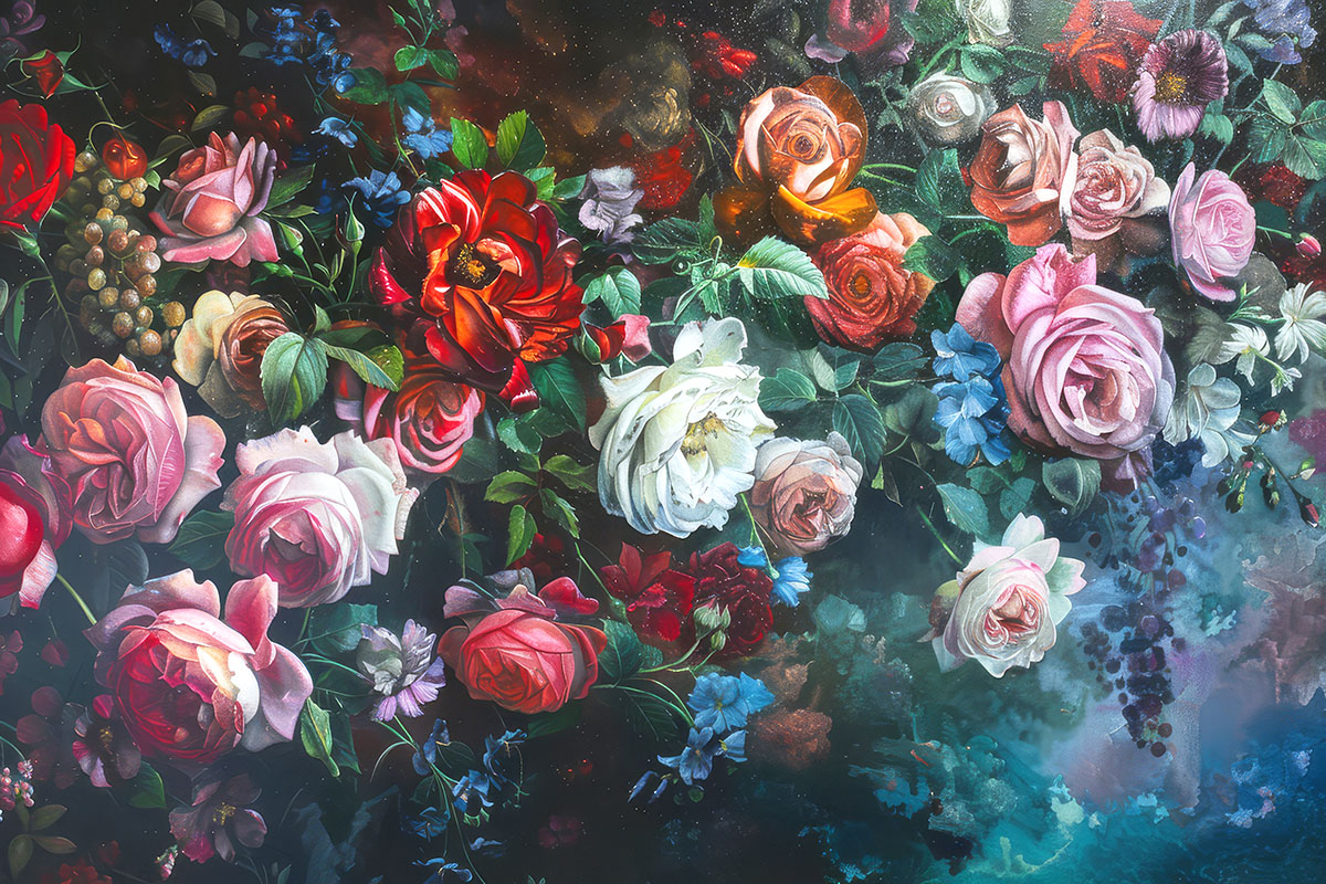 • Koyu Zemin üzerinde Suluboya Renkli Çiçekler Duvar Kağıdı 3 boyutlu şekilde satın alın!