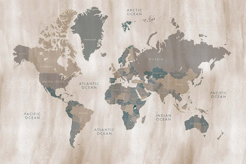 • Krem Bej Tonlarında Dünya Haritası Ülke isimleri Yazılı Duvar Kağıdı 3 boyutlu şekilde satın alın!