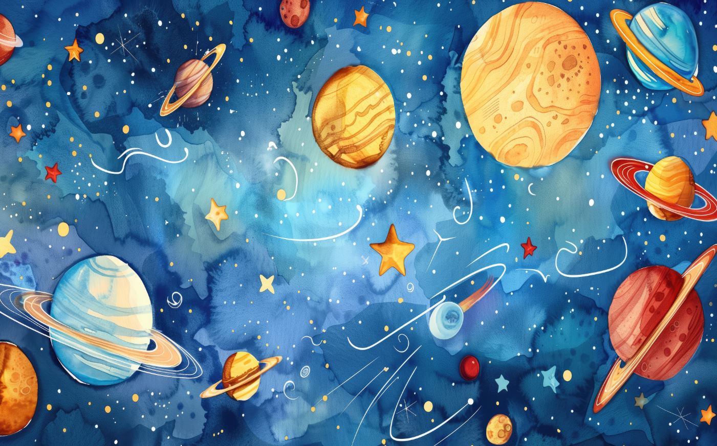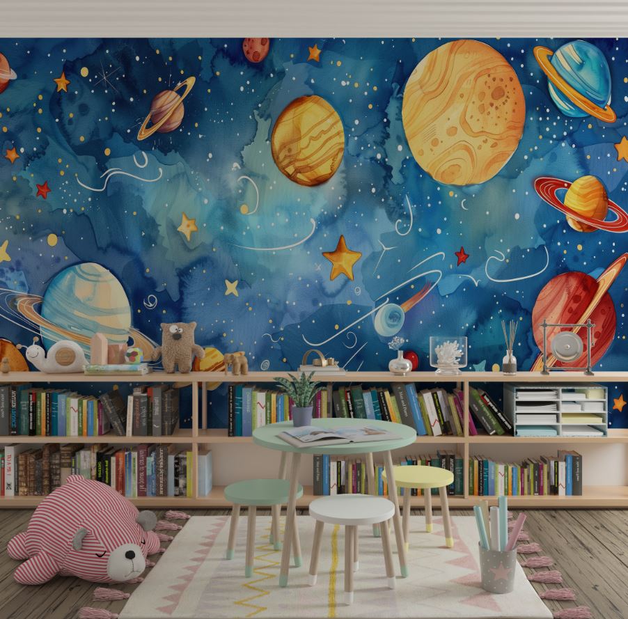 • Mavi Galaksi ve Renkli Gezegenler Çocuk Odası Duvar Kağıdı 3 boyutlu şekilde satın alın!