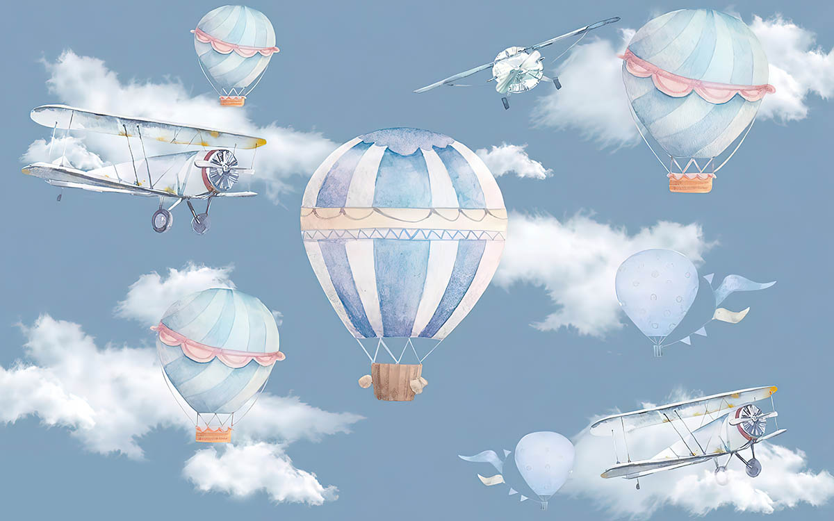 • Mavi Gökyüzünde Kanatlı Uçaklar ve Balonlar Duvar Kağıdı 3 boyutlu şekilde satın alın!