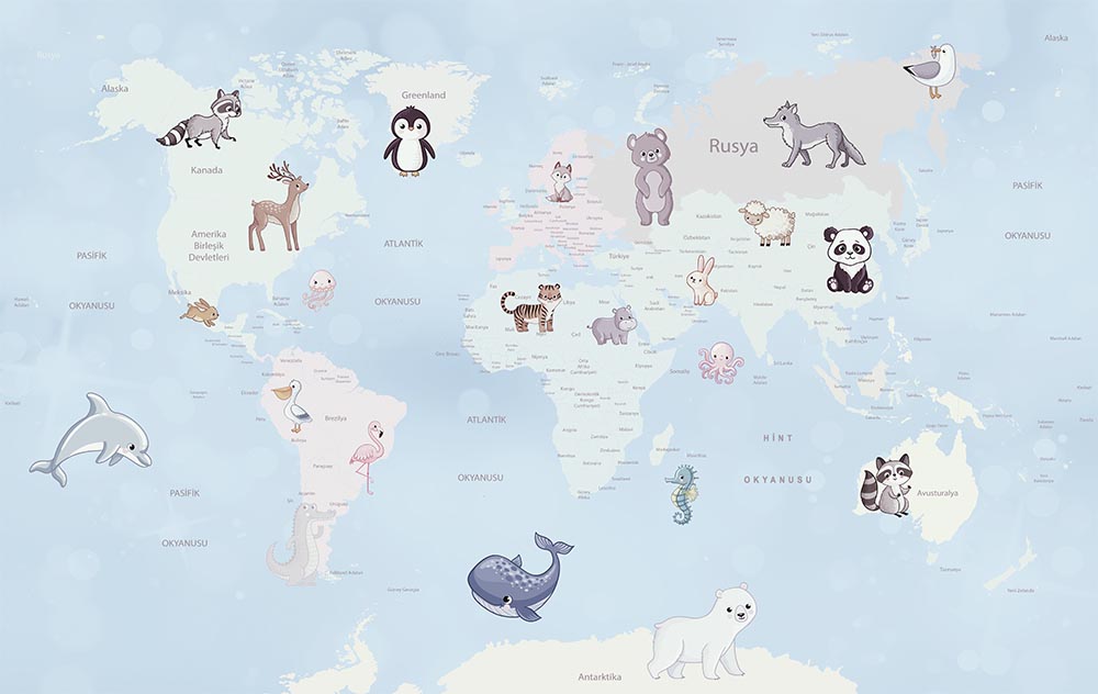 • Mavi Zemin Çocuk Odaları için Eğitici Dünya Haritası Duvar Kağıdı 3 boyutlu şekilde satın alın!