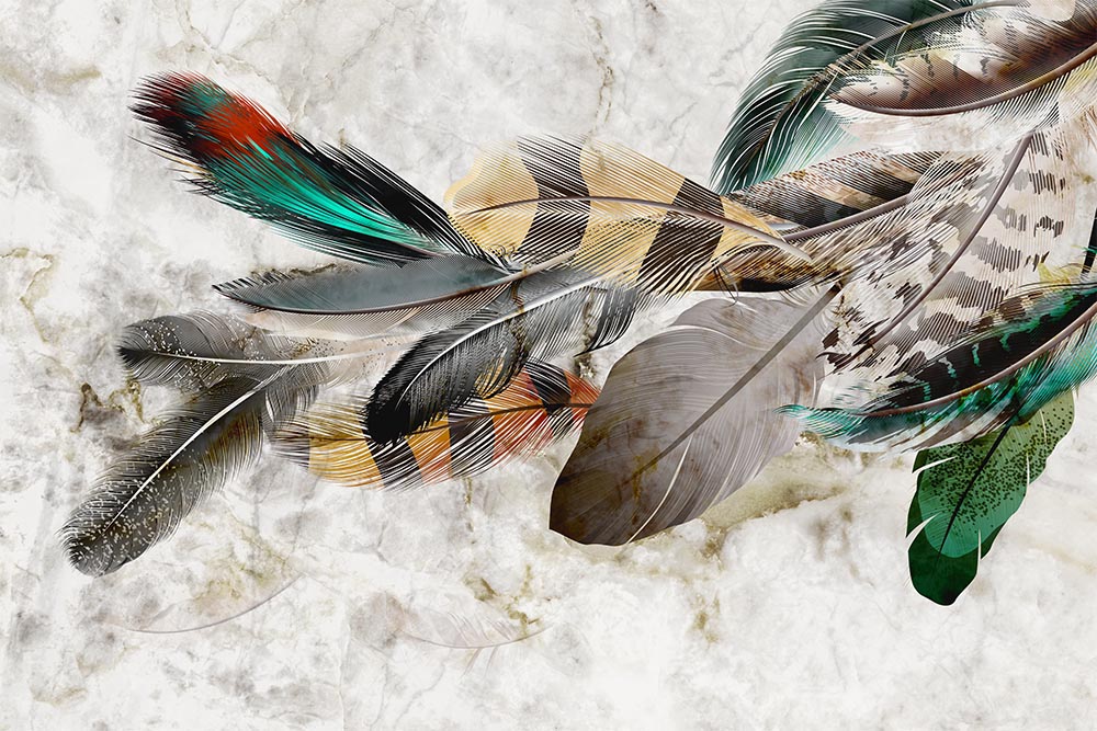 • Mermer Zemin Üzerinde Renkli Tüyler Duvar Kağıdı 3 boyutlu şekilde satın alın!