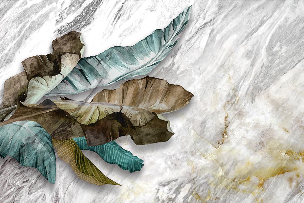 • Mermer Zemin Üzerinde Tropikal Yapraklar Duvar Kağıdı 3 boyutlu şekilde satın alın!