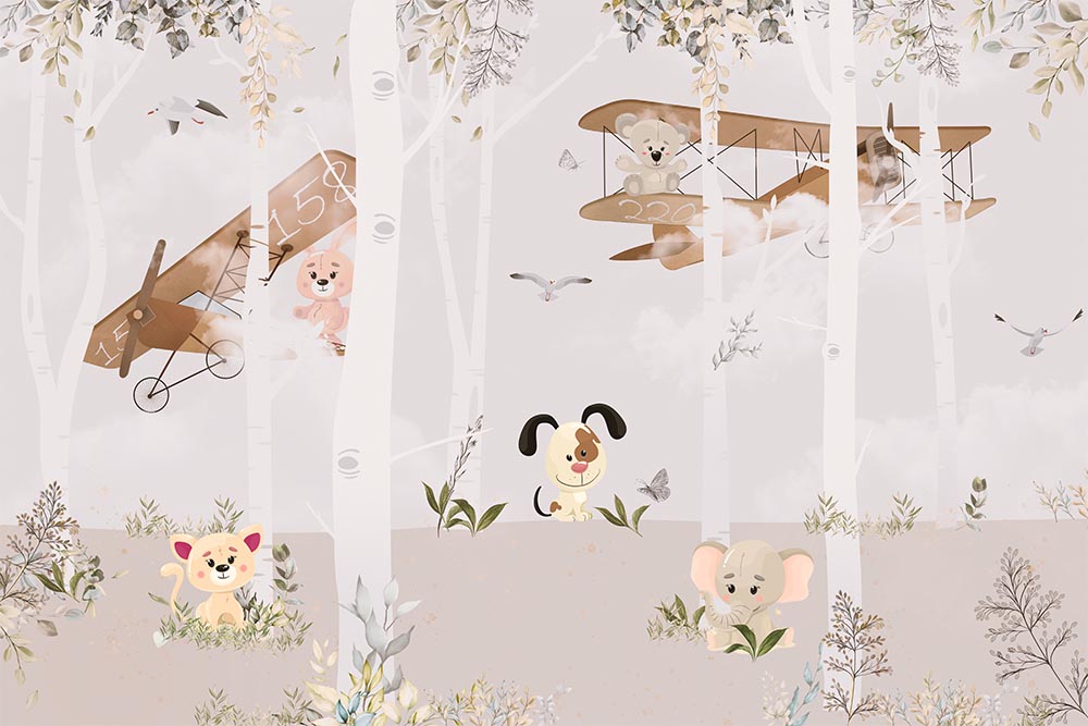 • Ormanda Sevimli Hayvanlar ve Uçaklar Duvar Kağıdı 3 boyutlu şekilde satın alın!