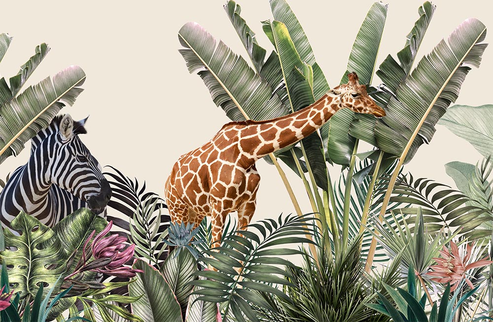 • Ormanda Zebra ve Zürafa Tropikal Yapraklar Duvar Kağıdı 3 boyutlu şekilde satın alın!