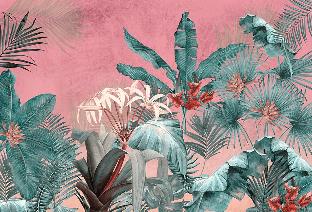 • Pembe Zemin Tropikal Ağaçlar Duvar Kağıdı 3 boyutlu şekilde satın alın!