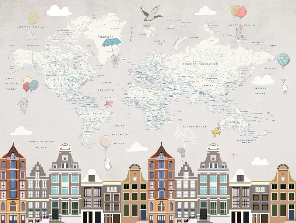 • Renkli Binalar Üzerinde Dünya Haritası Çocuk Odası Eğitici Duvar Kağıdı 3 boyutlu şekilde satın alın!