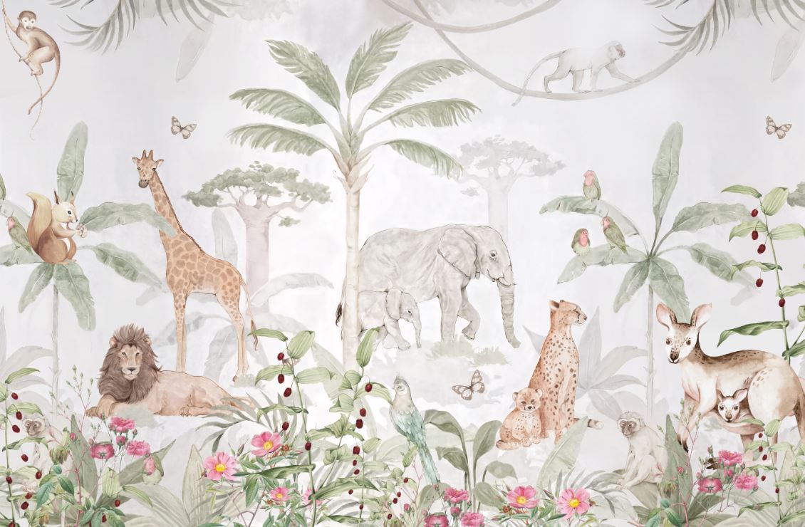 • Renkli Çiçekler ve yapraklar arasında Safari hayvanları duvar kağıdı 3 boyutlu şekilde satın alın!