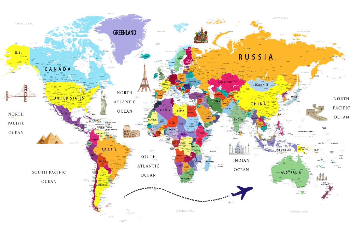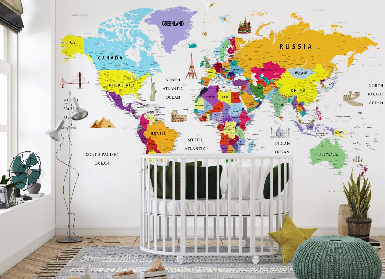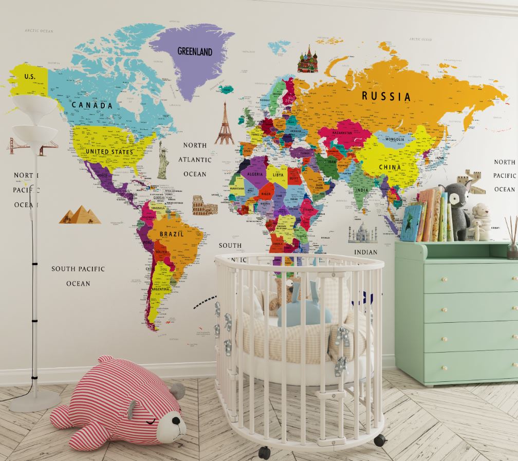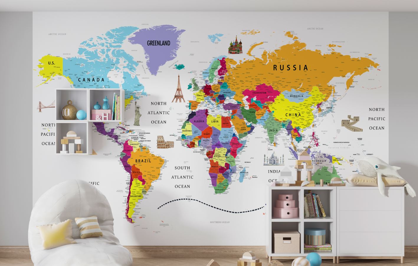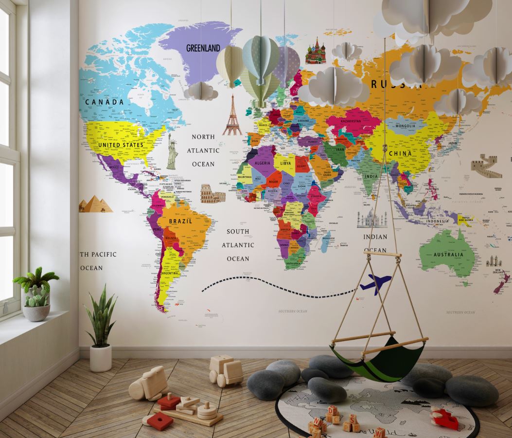 • Renkli Dünya Haritası Çocuk Odası Duvar Kağıdı 3 boyutlu şekilde satın alın!
