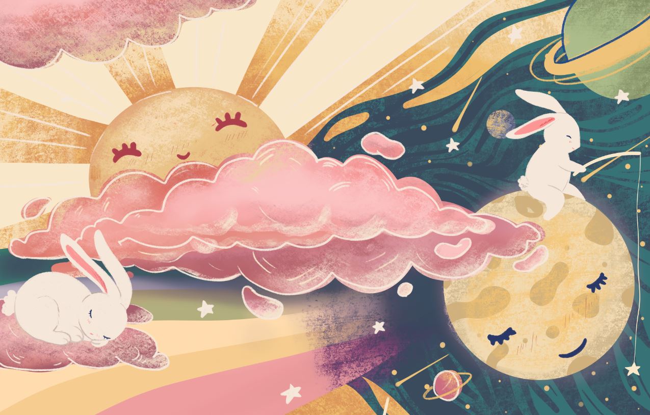 Renkli Gökyüzünde Sevimli Tavşanlar Çocuk Odası Duvar Kağıdı