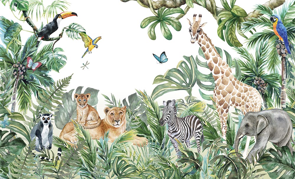 • Safari Çocuk Odası Duvar Kağıdı - Tropikal safari hayvanları Duvar Kağıdı 3 boyutlu şekilde satın alın!