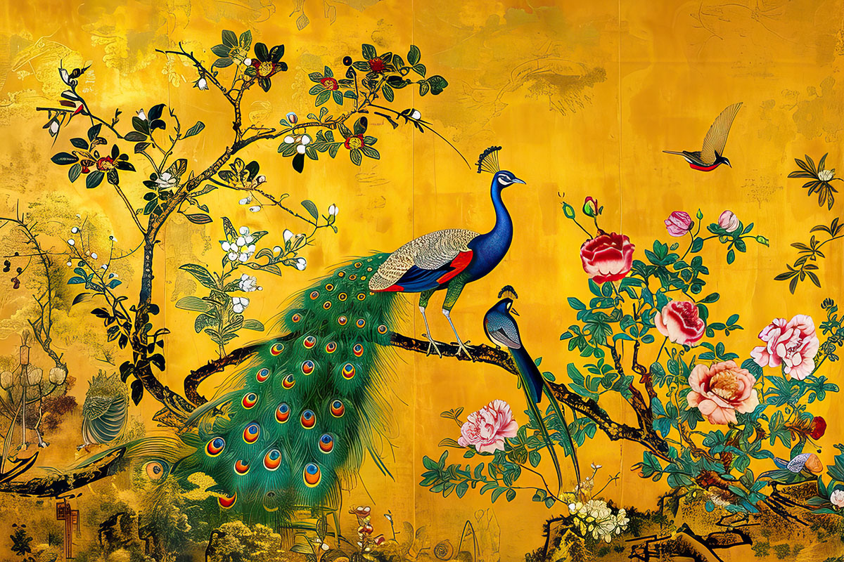• Sarı Zemin üzerinde Tavus Kuşu Duvar Kağıdı 3 boyutlu şekilde satın alın!