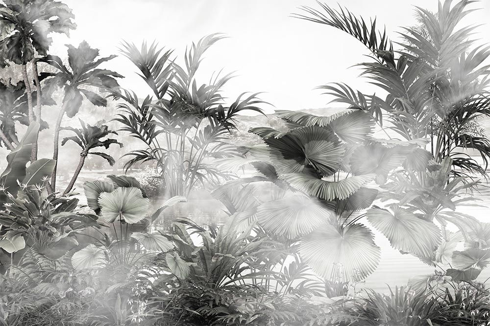 • Sisli Orman Manzarası Tropikal Yapraklar ve Ağaçlar Duvar Kağıdı 3 boyutlu şekilde satın alın!