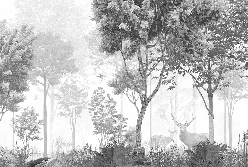 • Siyah Beyaz Eskitme Tarz Orman Ağaç Manzarası Duvar Kağıdı 3 boyutlu şekilde satın alın!