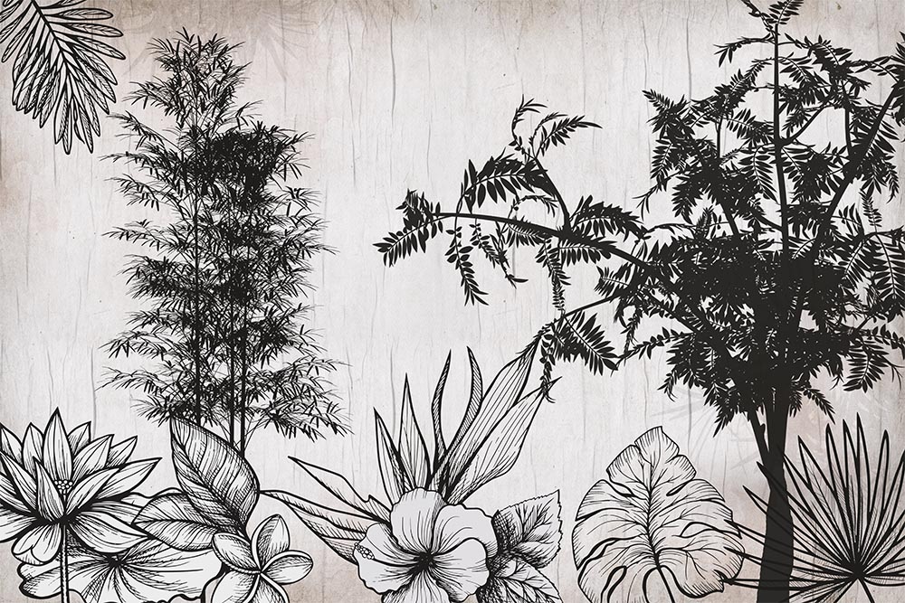 • Siyah Beyaz Tropikal Ağaç ve Yapraklar Duvar Kağıdı 3 boyutlu şekilde satın alın!
