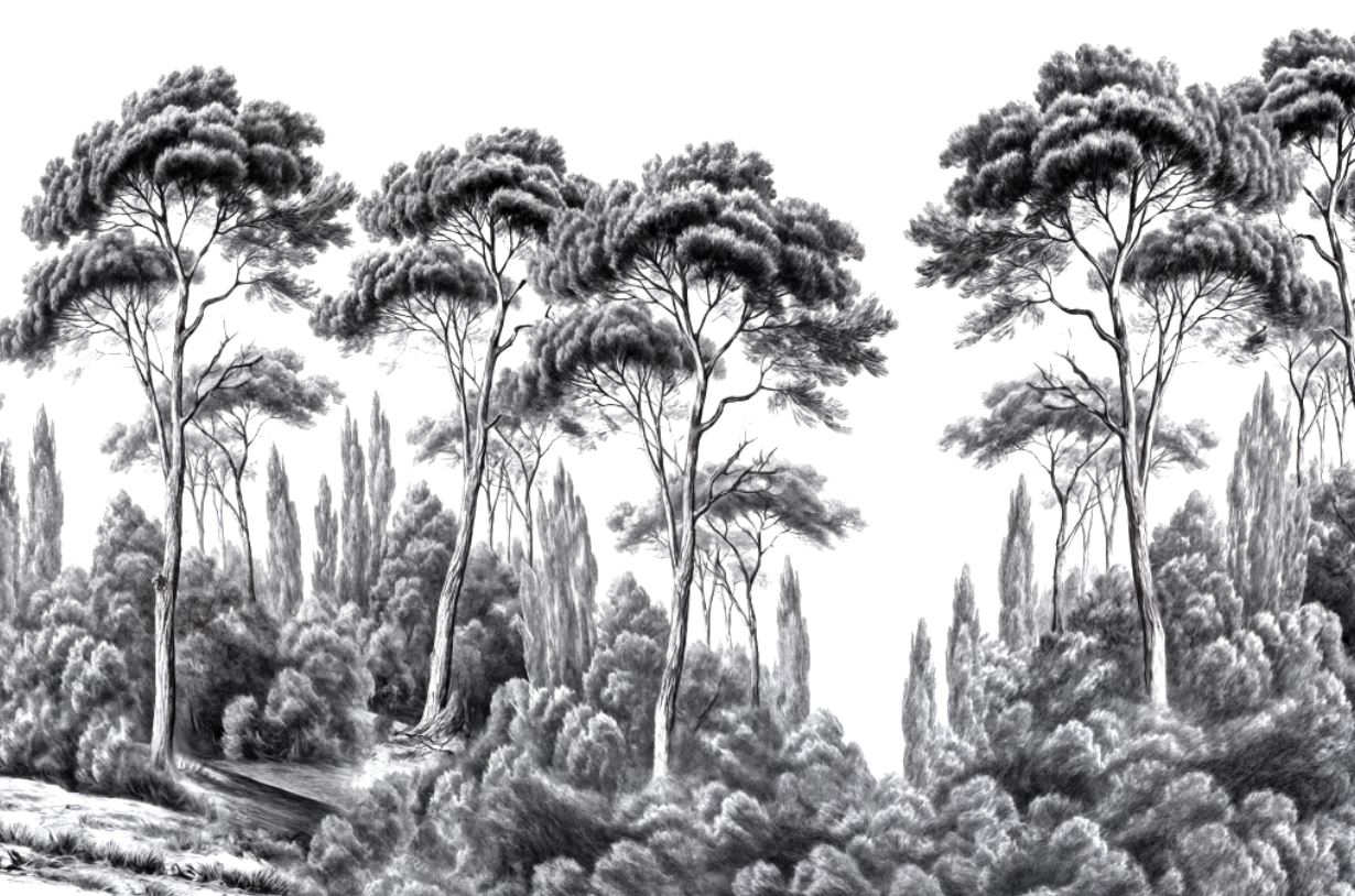 • Siyah Beyaz Vintage tarz eskitme orman manzarası duvar kağıdı 3 boyutlu şekilde satın alın!