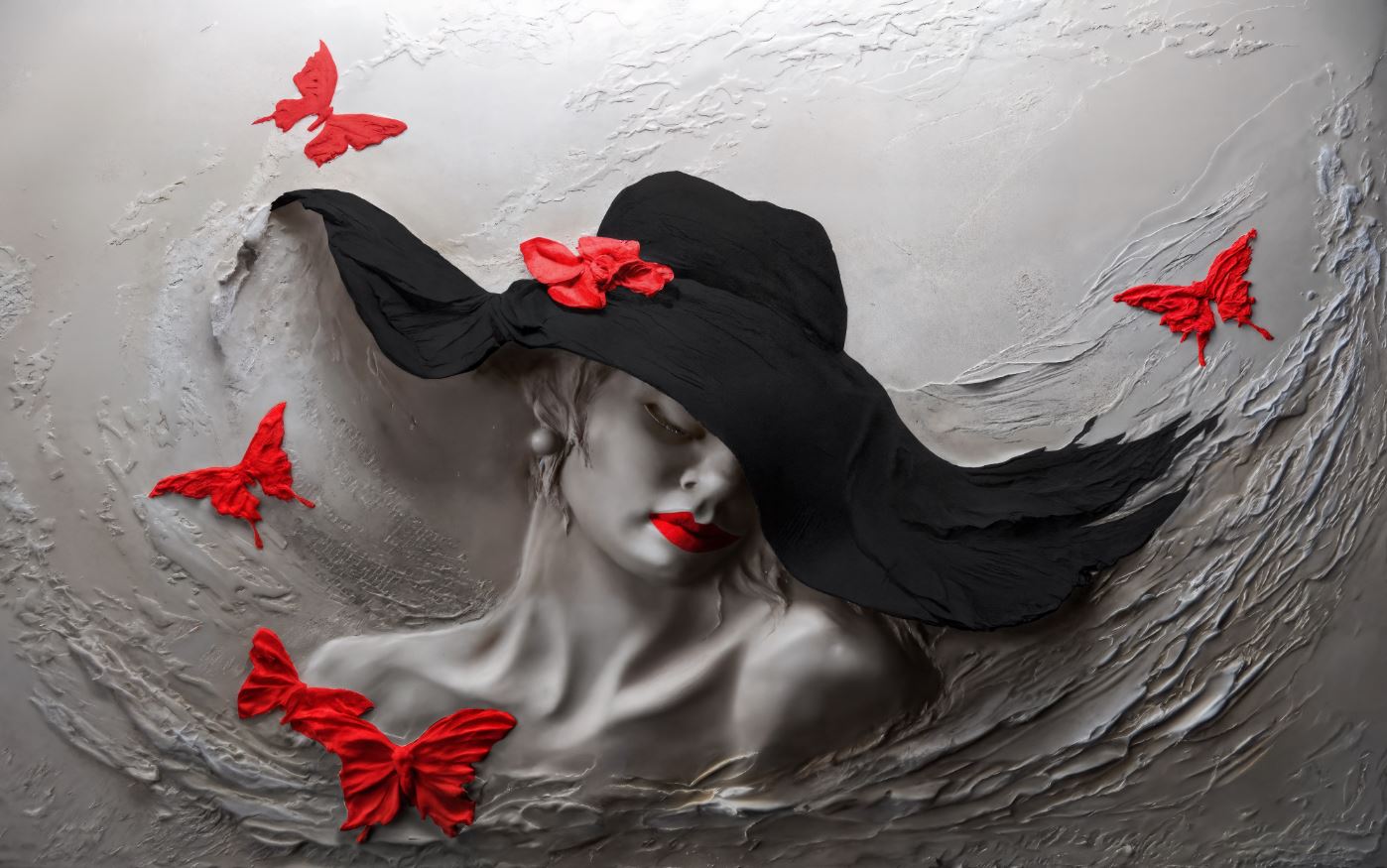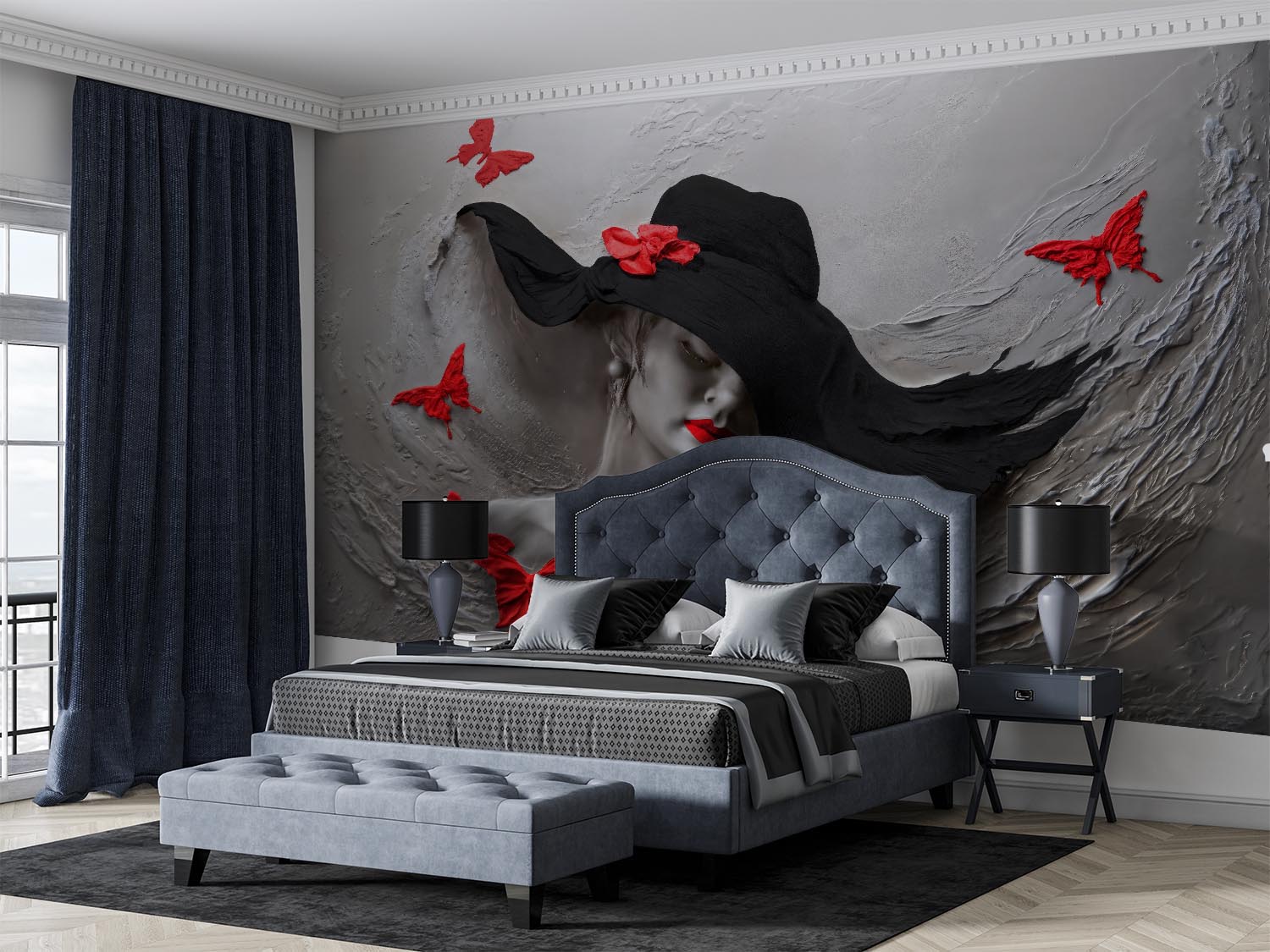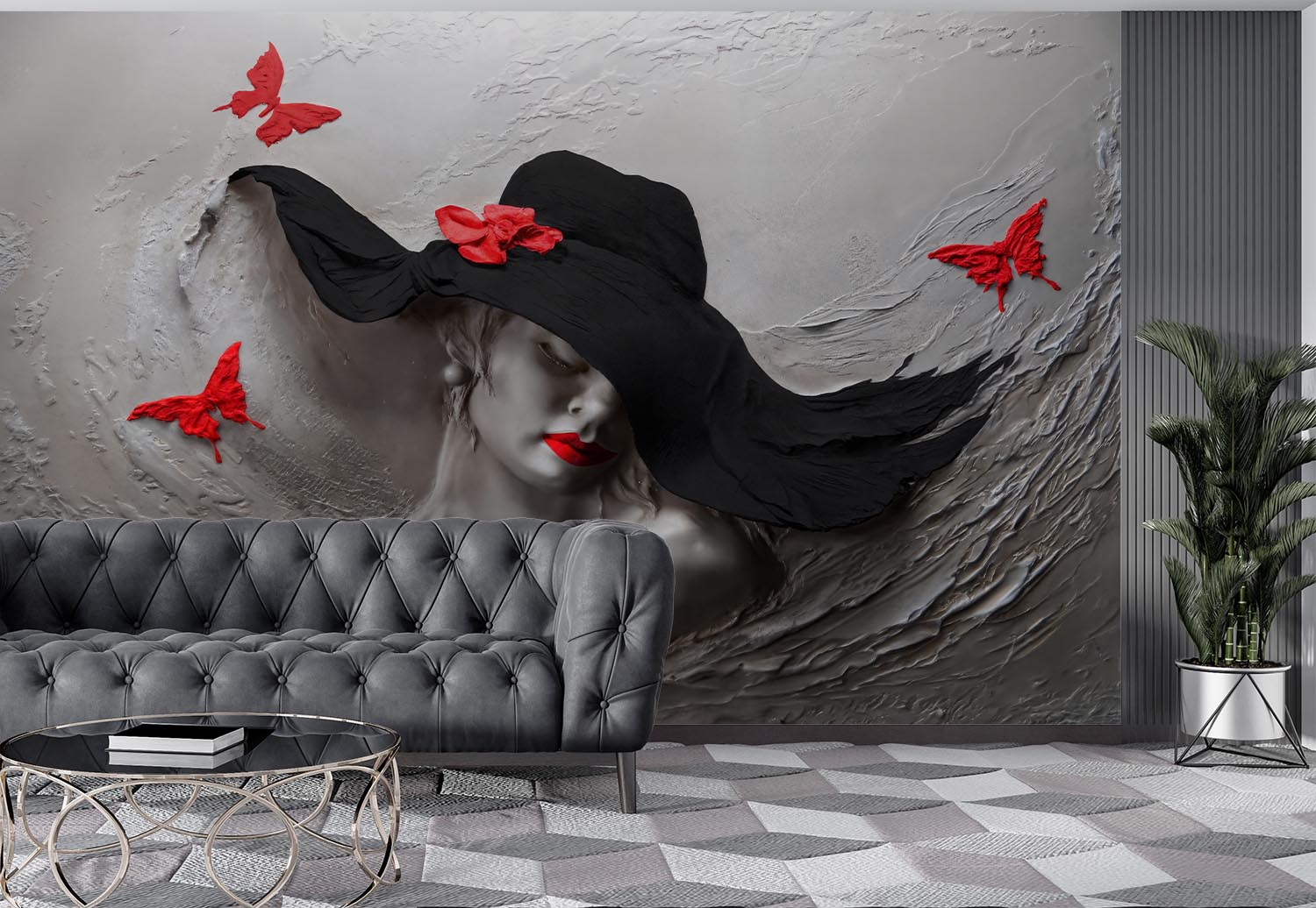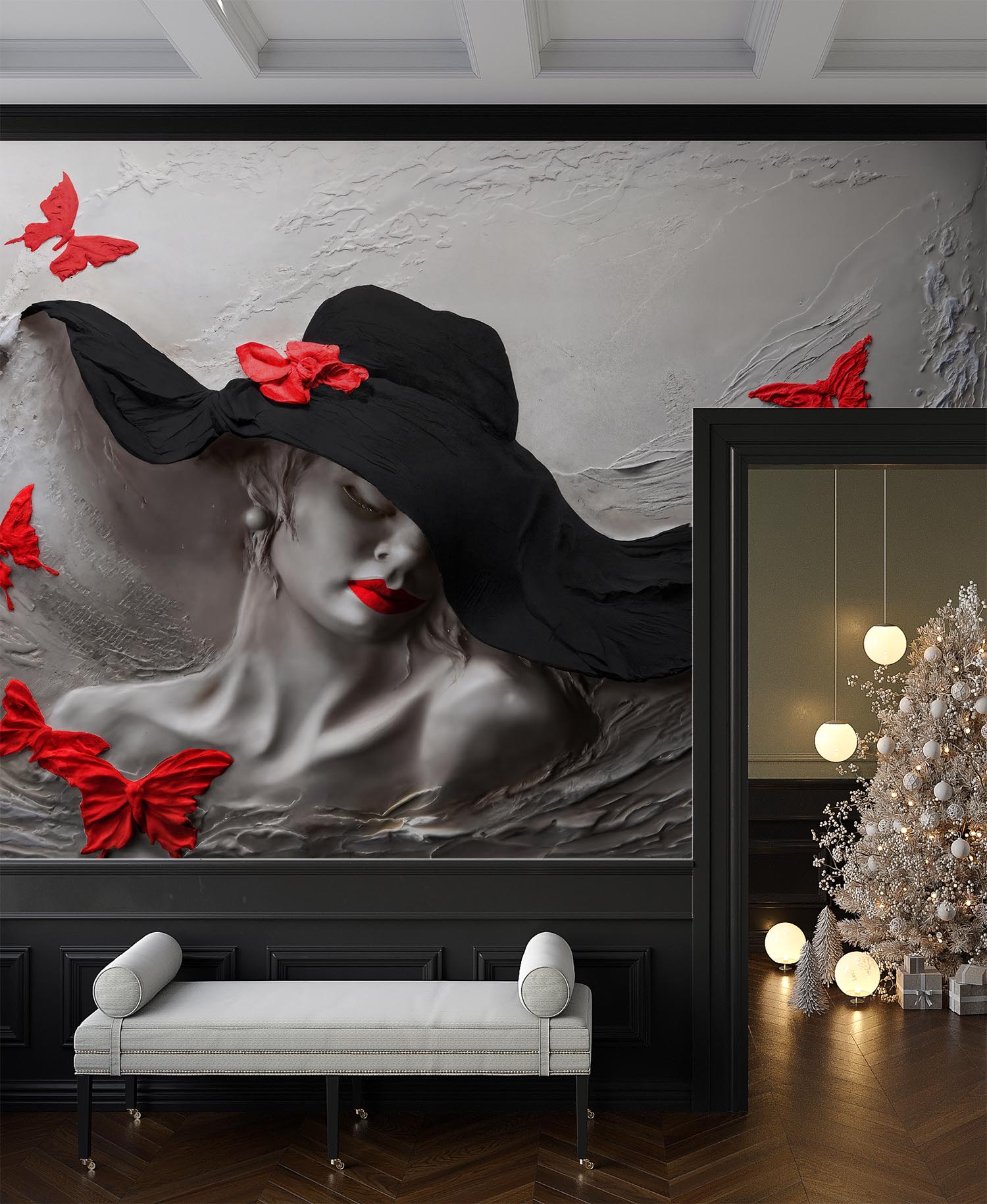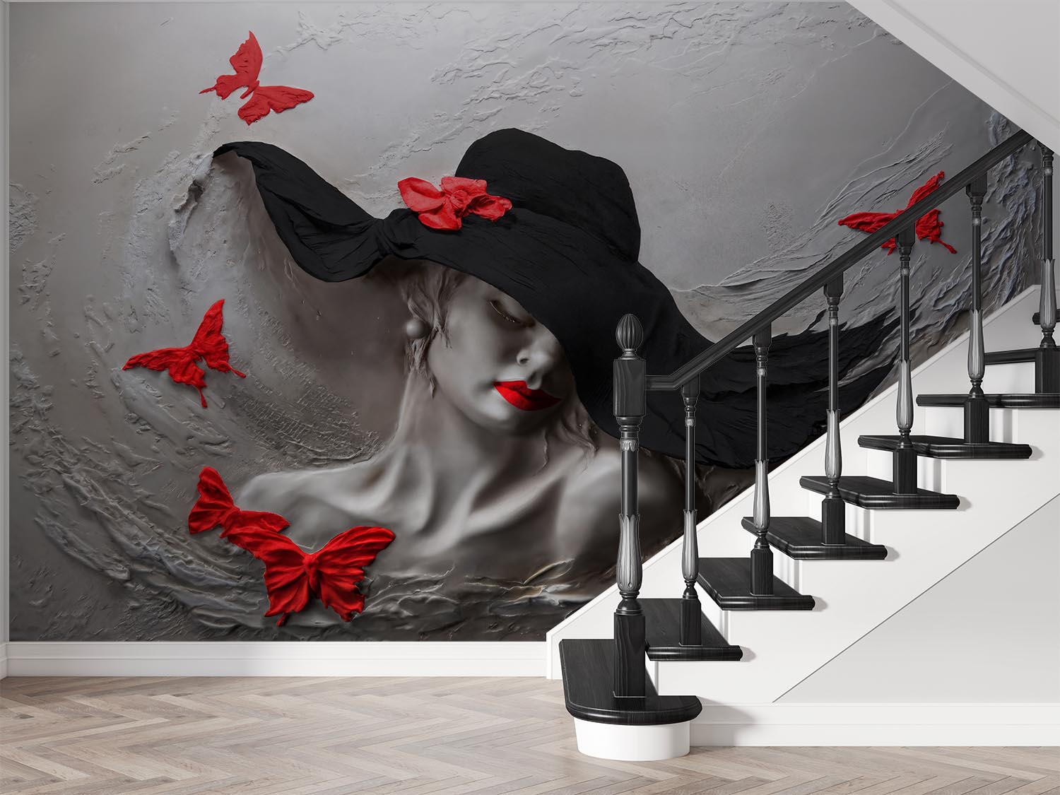 • Siyah Şapkalı Kadın ve Kırmızı Kelebekler Duvar Kağıdı 3 boyutlu şekilde satın alın!