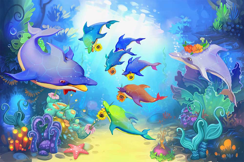 • Su Altında Sevimli Yunus Balıkları Duvar Kağıdı 3 boyutlu şekilde satın alın!