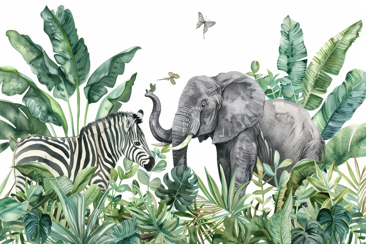 • Sulu Boya tarzında Ağaçlar yapraklar ve Hayvanlar Duvar Kağıdı 3 boyutlu şekilde satın alın!