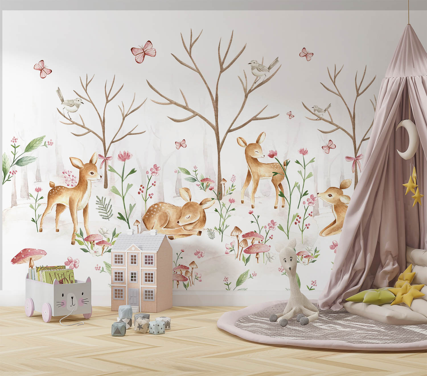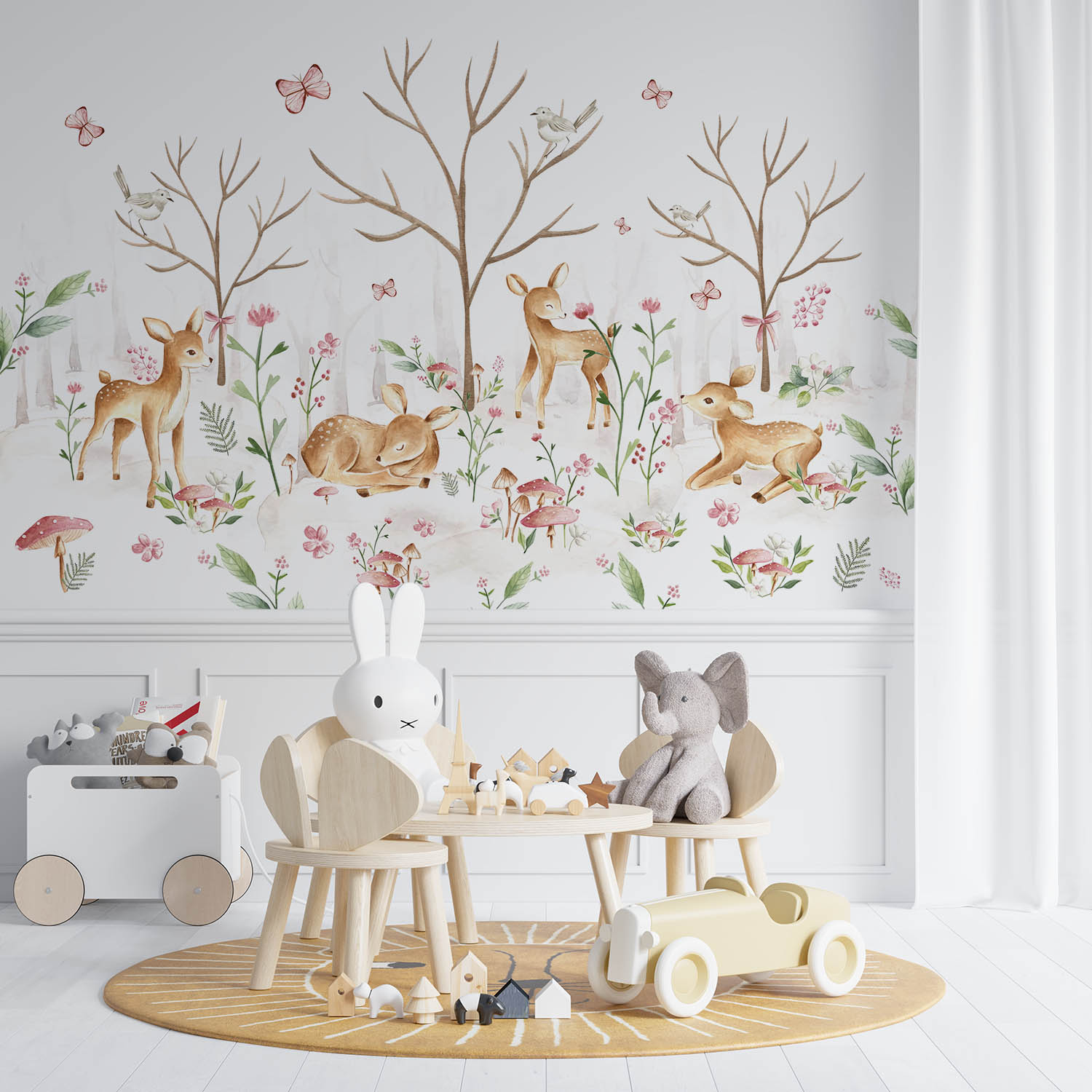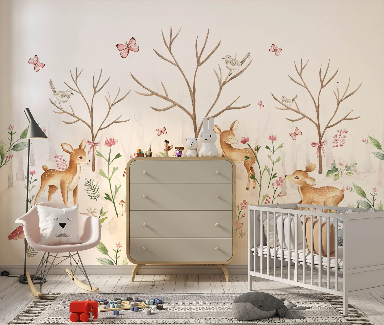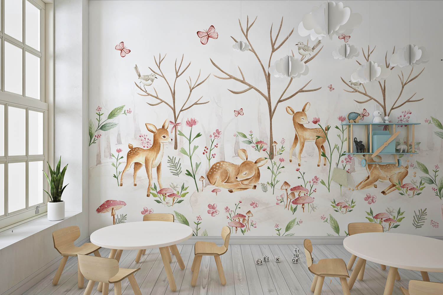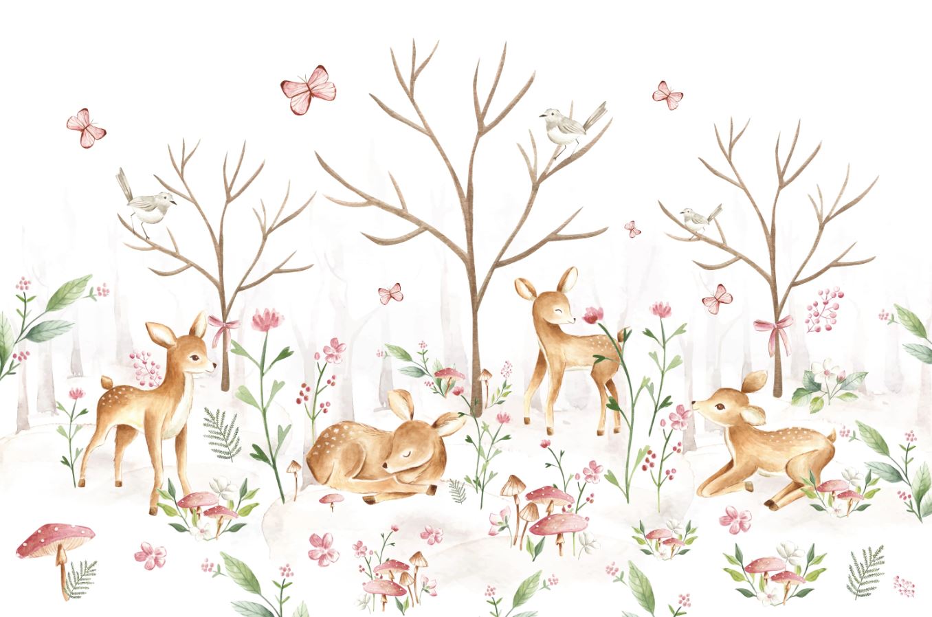 • Suluboya Tarz Ağaçlar ve Yapraklar Arasında Sevimli Ceylanlar Duvar Kağıdı 3 boyutlu şekilde satın alın!