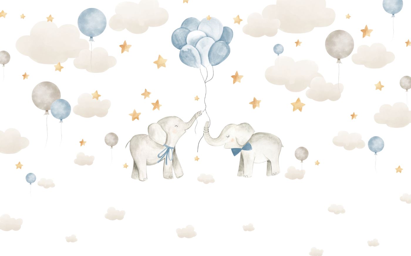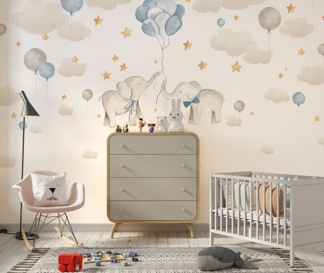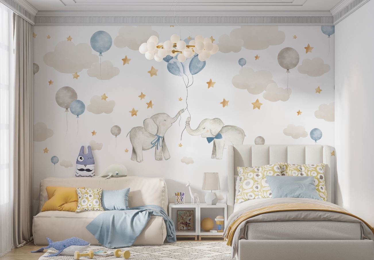 • Suluboya Tarz Bulutlar Balonlar ve Sevimli Filler Çocuk Odası Duvar Kağıdı 3 boyutlu şekilde satın alın!