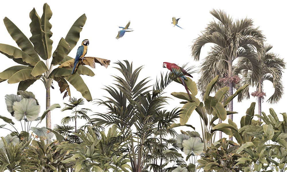 • Tropikal Amazon Ağaçlarında Papağanlar Duvar Kağıdı 3 boyutlu şekilde satın alın!