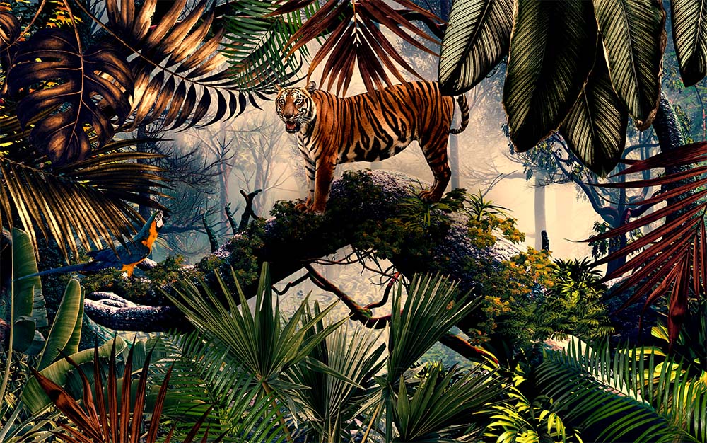 • Tropikal Orman içerisinde Kaplan Duvar Kağıdı 3 boyutlu şekilde satın alın!