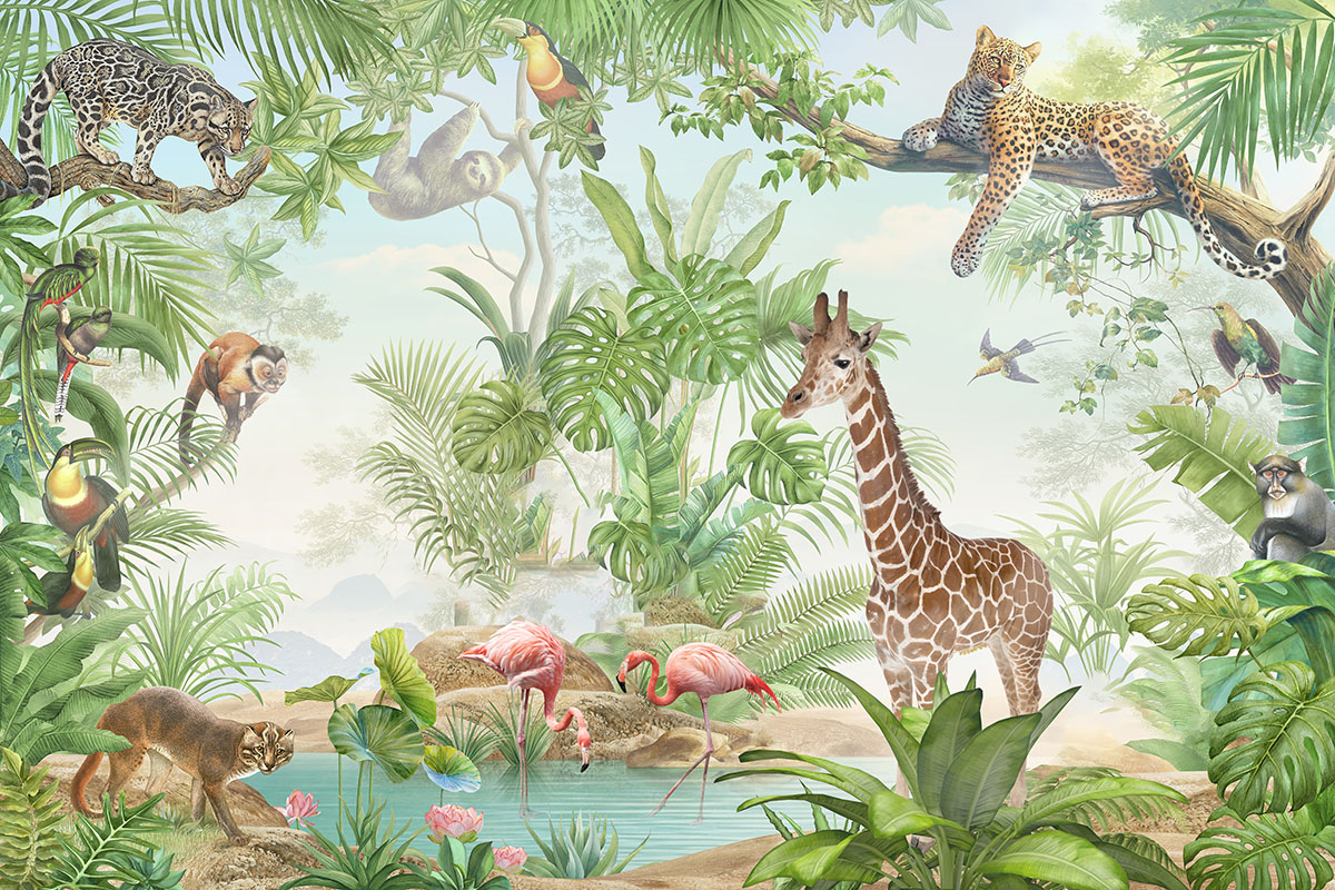 • Tropikal Orman içinde Safari Hayvanları Çocuk odası Duvar Kağıdı 3 boyutlu şekilde satın alın!