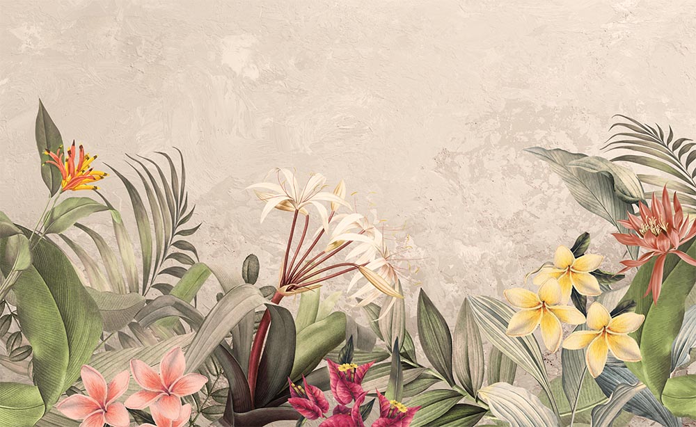 • Tropikal Renkli Yaprak ve Çiçekler Özel Tasarım Duvar Kağıdı 3 boyutlu şekilde satın alın!