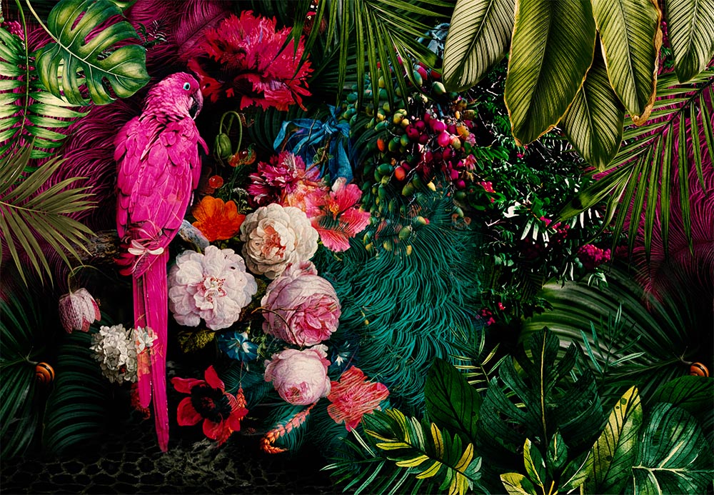 • Pembe Papağan Tropikal Yapraklar Duvar Kağıdı 3 boyutlu şekilde satın alın!