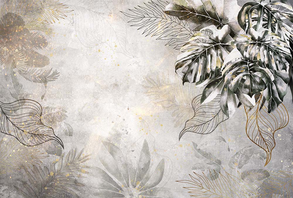 • Tropikal Yapraklar Duvar Kağıdı Gri - Gold Tonları 3 boyutlu şekilde satın alın!