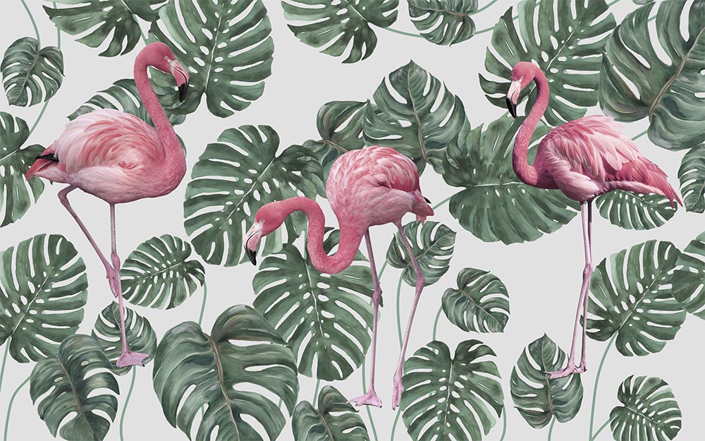 • Tropikal Yapraklar ve Pembe Flamingolar Duvar Kağıdı 3 boyutlu şekilde satın alın!