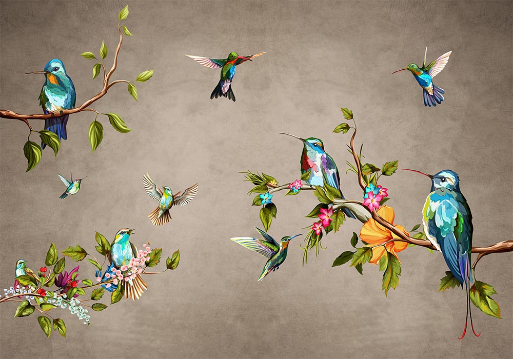 • Tropikal Yapraklar ve Renkli Kuşlar Duvar Kağıdı 3 boyutlu şekilde satın alın!