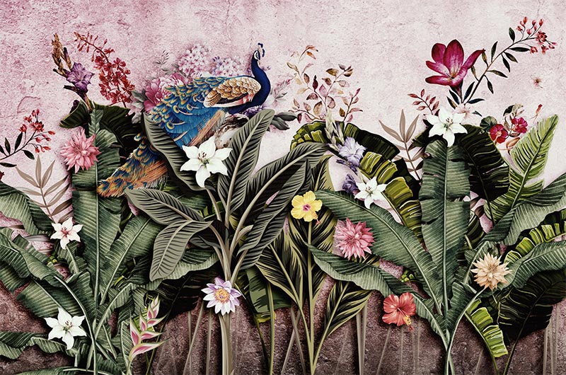 • Tropikal Yapraklar ve Tavus Kuşu Duvar Kağıdı 3 boyutlu şekilde satın alın!