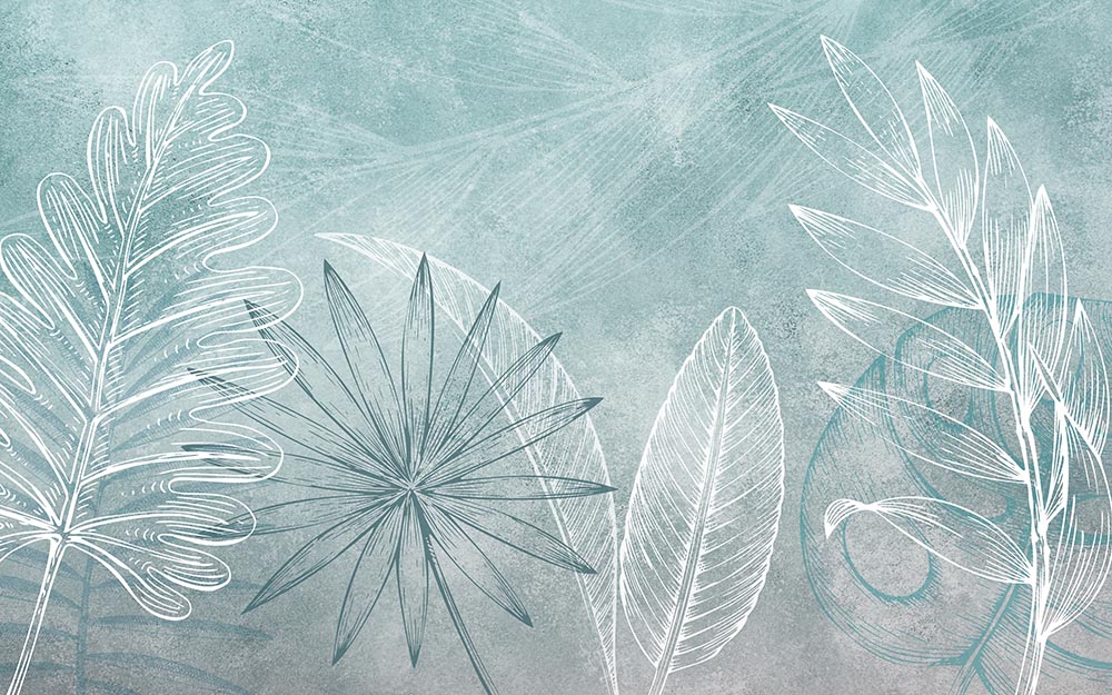 • Turkuaz - Beyaz Yapraklar Duvar Kağıdı 3 boyutlu şekilde satın alın!