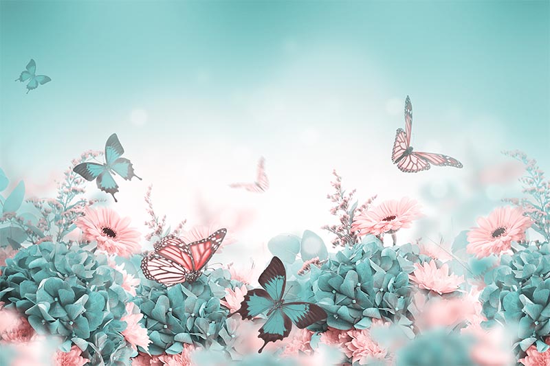 Turkuaz Pembe Çiçekler ve Kelebekler