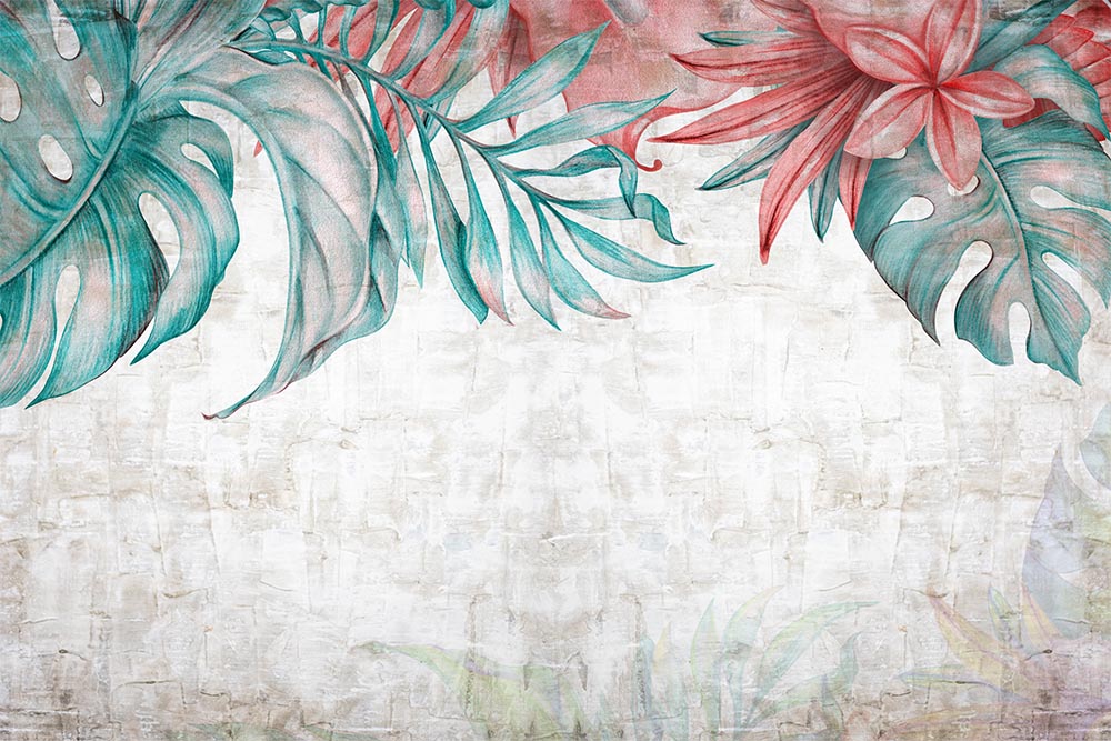 • Turkuaz Renkli Tropikal Yapraklar Duvar Kağıdı 3 boyutlu şekilde satın alın!