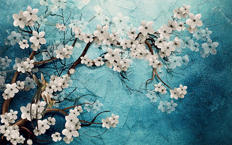 • Turkuaz Zemin Üzerinde Ağaç Dalları ve Beyaz Çiçekler 3 boyutlu şekilde satın alın!