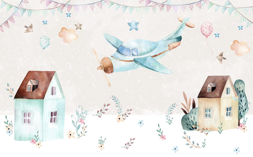• Uçak ve Evler Çocuk Odası Duvar Kağıdı 3 boyutlu şekilde satın alın!