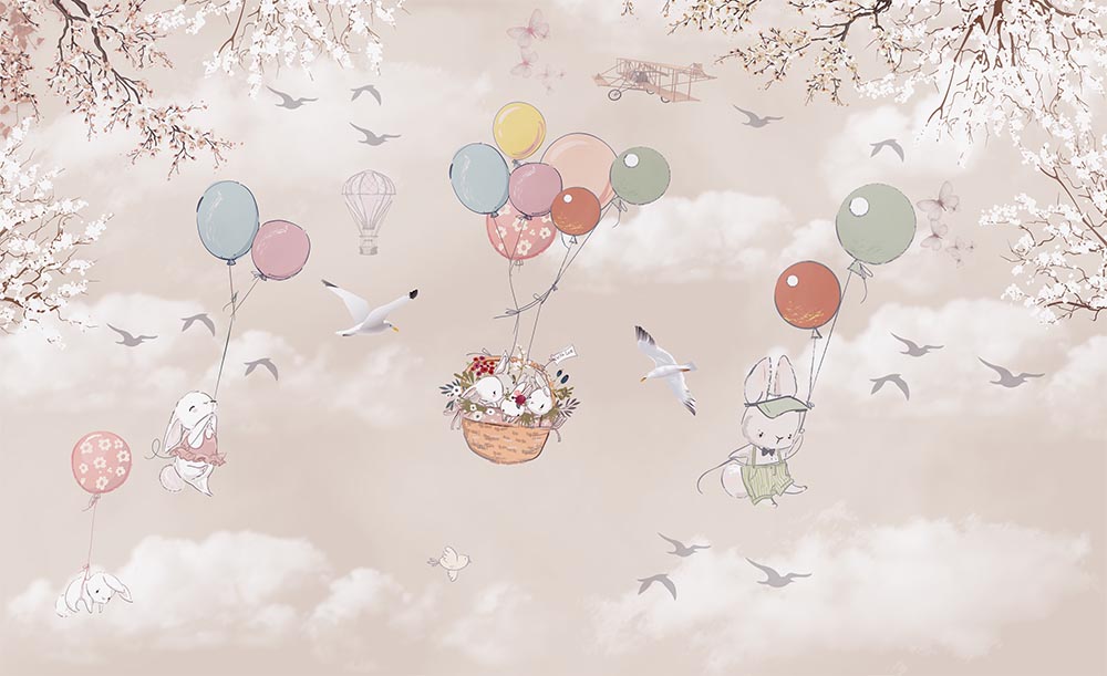 • Uçan Balonlar ve Sevimli Tavşanlar Çocuk Odası Duvar Kağıdı 3 boyutlu şekilde satın alın!