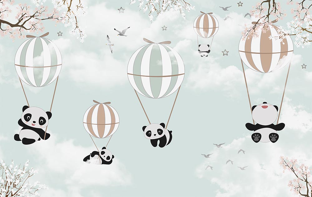 • Uçan Balonlara Asılı Sevimli Pandalar Duvar Kağıdı 3 boyutlu şekilde satın alın!