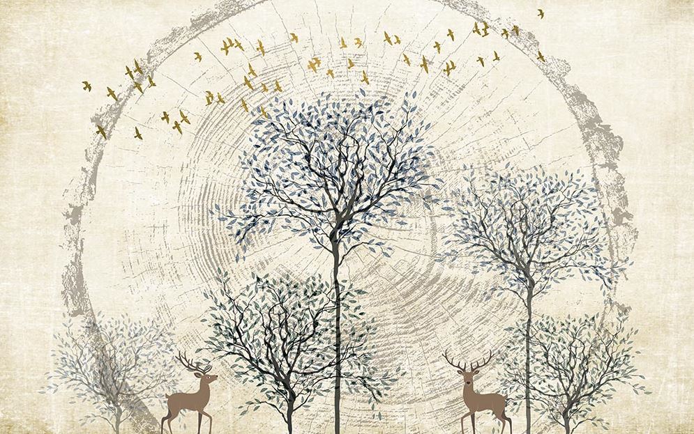 • Vintage Tarz Ağaç Dalları ve Geyikler Duvar Kağıdı 3 boyutlu şekilde satın alın!
